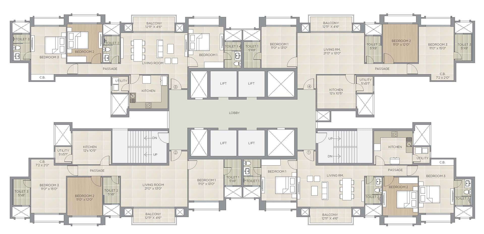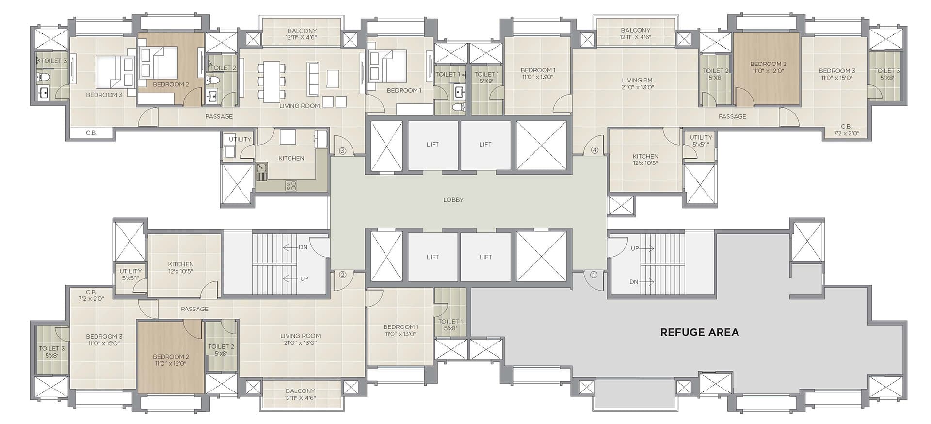 - Minor variations up to (+/-) 3% in actual carpet areas may occur on account of site conditions/columns/finishes etc.