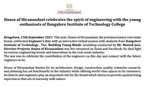 House of Hiranandani celebrates the spirit of engineering with the young enthusiasts of Bangalore Institute of Technology College