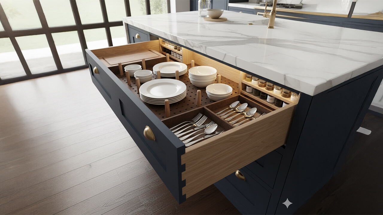 Premium hardware enhances your kitchen’s daily use. Quality hinges should include soft-close mechanisms built into hardened steel components with six-way adjustability. This allows fine-tuning as cabinet doors naturally shift with seasonal changes. Undermount steel glides with full extension give complete access to drawer contents while working smoothly and quietly.