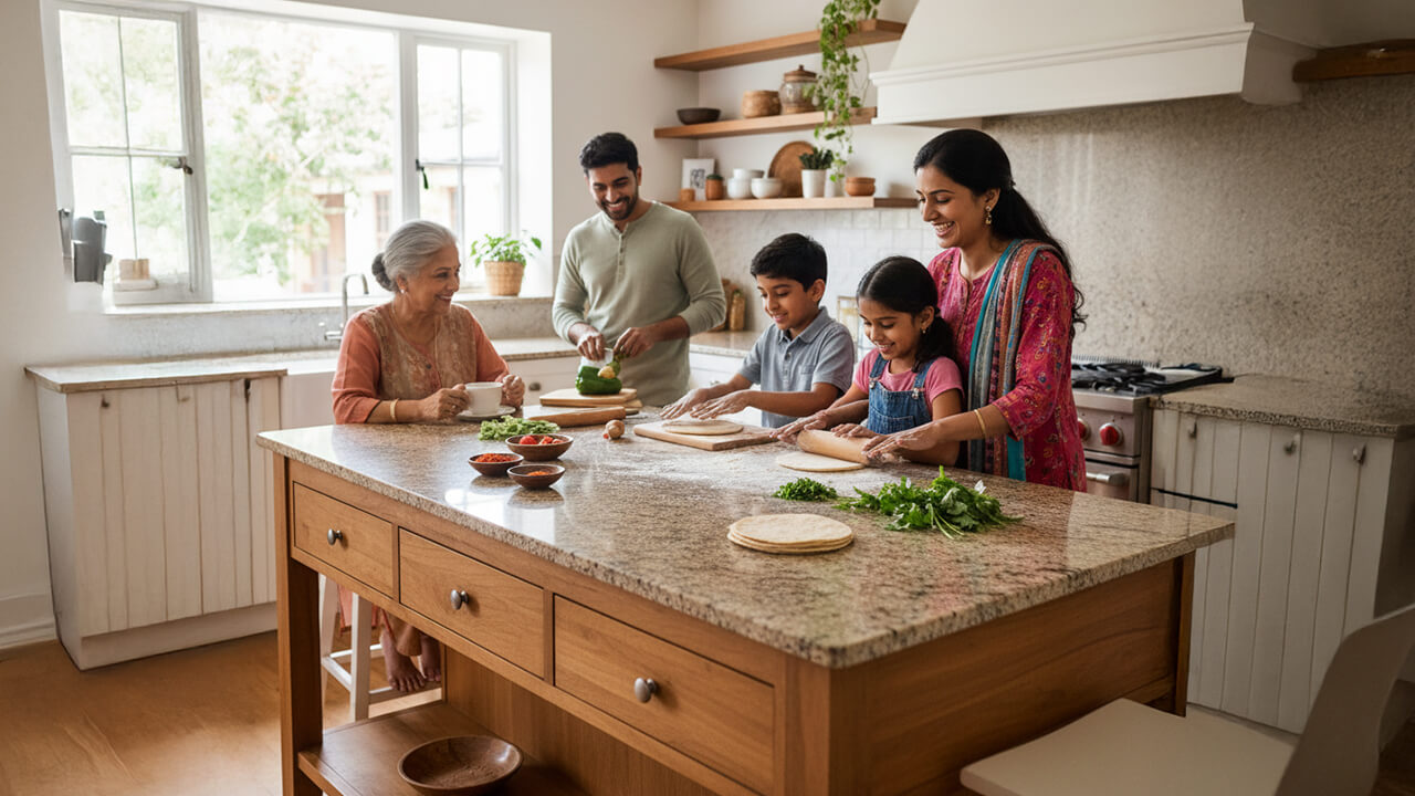 These kitchens bring together the richness of Indian craftsmanship with the efficiency of global design. The result is a space that feels both timeless and cutting-edge. Think of matte-finished granite countertops paired with ornate lighting inspired by royal palaces, or sleek induction setups placed beneath hand-carved arches. Decorative inlays, copper sinks, and muted gold accents are also being incorporated to enhance the luxurious appeal while maintaining cultural authenticity. Many homeowners are also experimenting with regional influences, such as Chettinad-style tiles from Tamil Nadu, Rajasthan’s marble inlays, or Kerala’s polished teak wood finishes, giving each kitchen a distinct regional character.